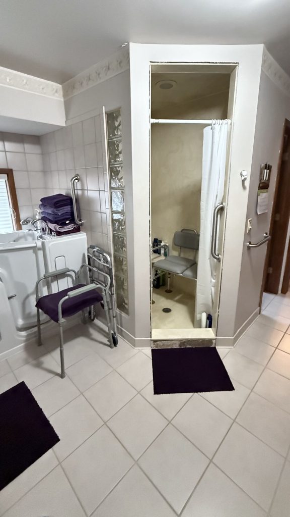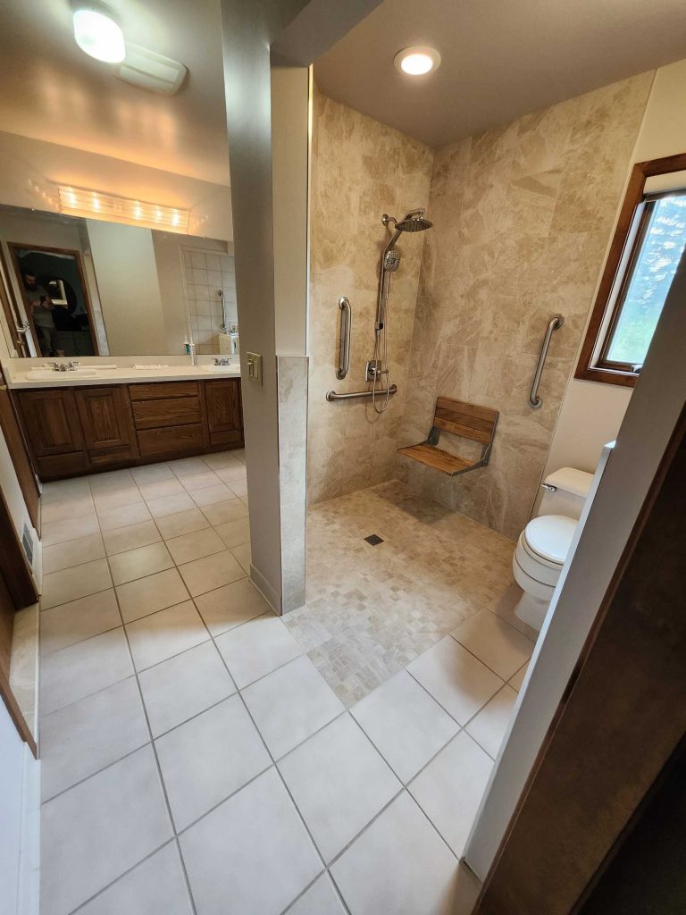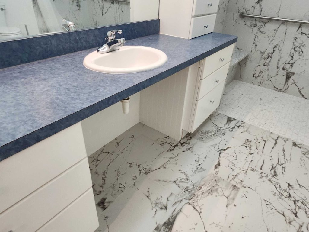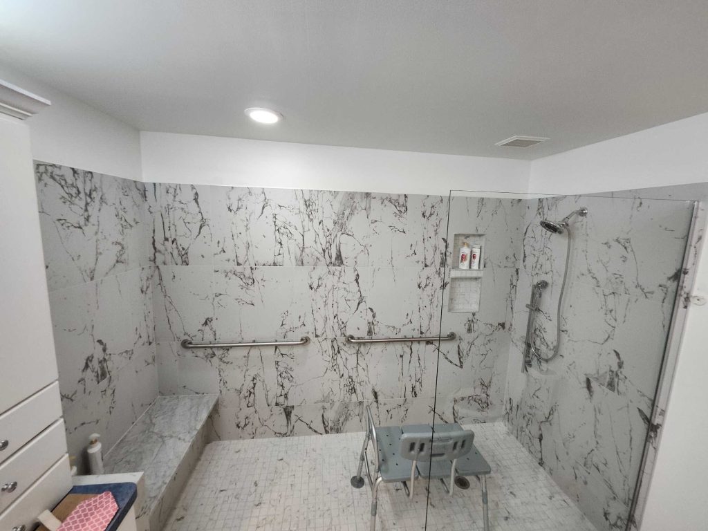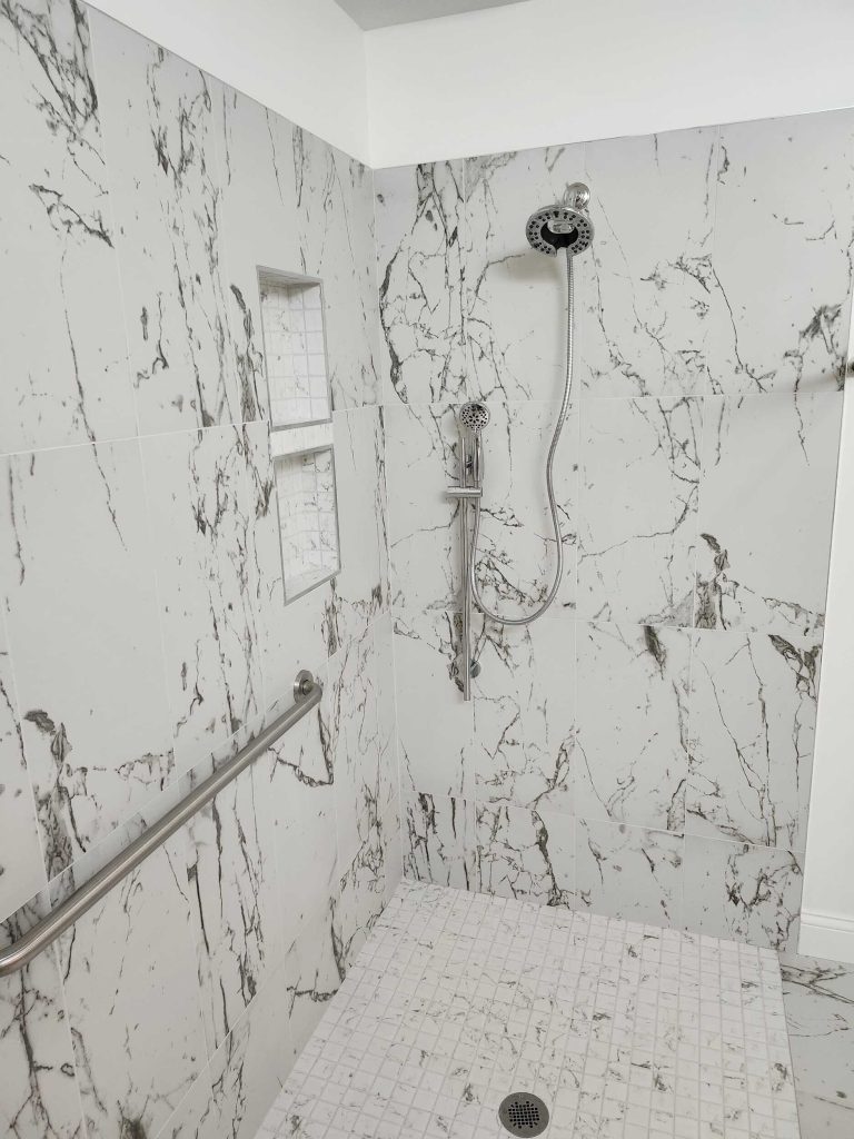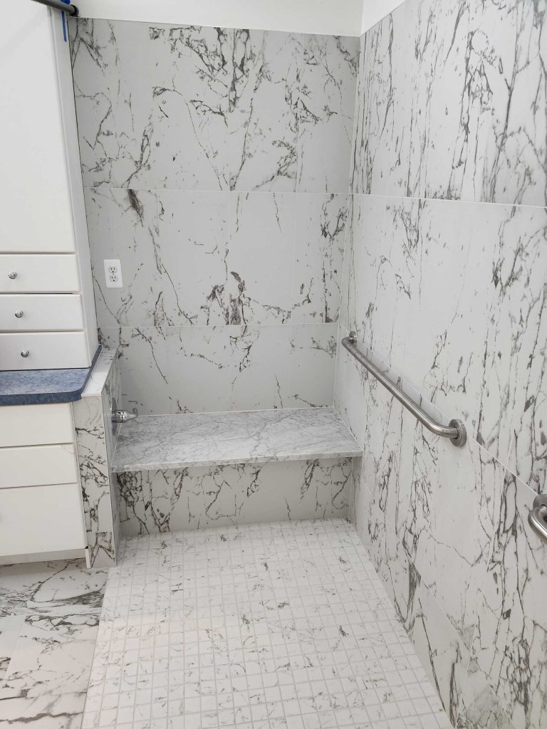 This customer noticed her mobility was becoming limited and wanted a shower that was easier to access. We installed a FIBO bath system—a modern alternative to traditional ceramic tile that provides a fully waterproof wall solution, perfect for bathrooms, kitchens, and any space requiring durability and easy cleaning. At her request, we retained her existing tile floor to help save on costs, and our skilled craftsmen made it work seamlessly. The result is a beautiful, functional shower area that she can now access with ease and confidence.