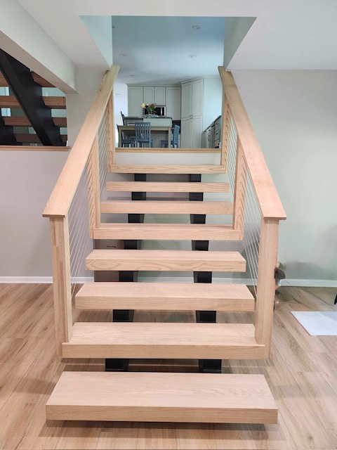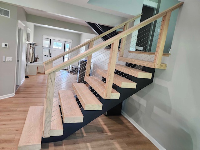 The floating treads, made from thick, natural wood, create a clean and airy look while showcasing the grain of the material. The solid black steel stringer adds bold contrast and a sleek contemporary edge, giving the entire structure both strength and style. The cable railing system and matching wood posts complete the design, offering an open feel that pairs perfectly with the large windows and natural light in the space.